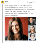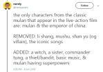 It’s literally not even fucking Mulan anymore. It’s just another random movie by now. Kids grew up with Mulan and are now older and want to see the potential that this movie could have to help society see that diversity is a good thing. It’s good for people to be themselves. And Mulan shows kids that sometimes you have to do hard things in order to achieve what you want/need. Why would they ever change something so drastic like that?