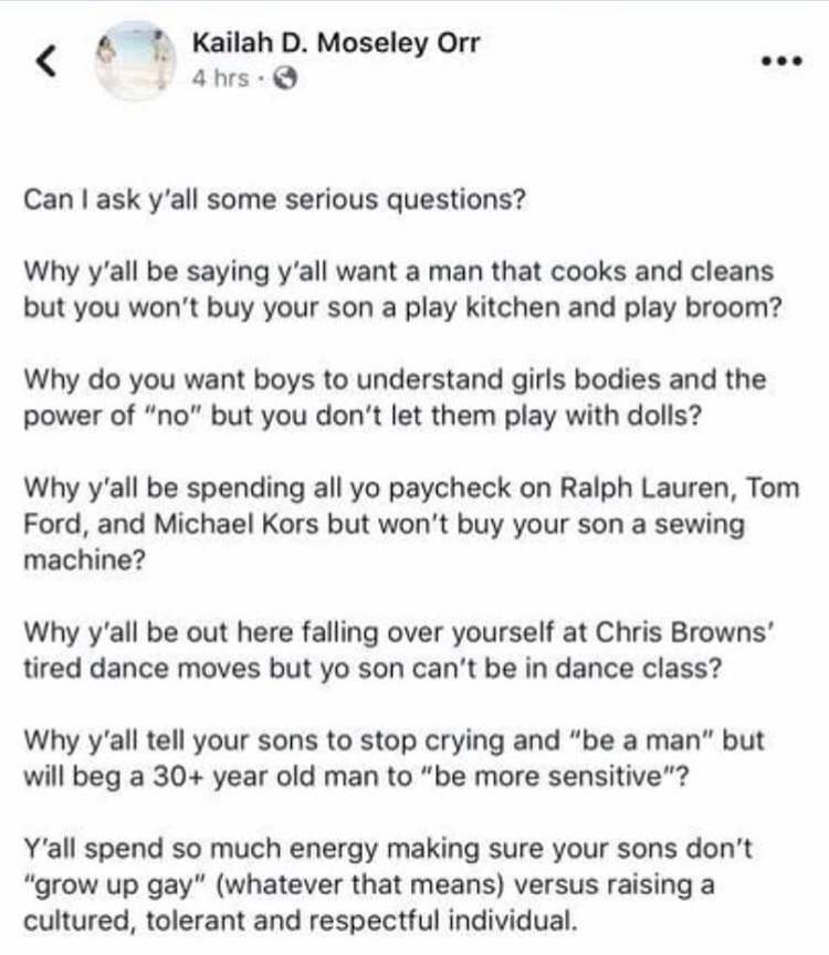 michellegruppetta8387 Uncategorized July 1, 2018December 17, 2018 1 Minute shitposts-n-shenanigans: thelovelybones124: Ima just leave this here. No one should get offended by any of this because this is literally saying “treat your son like a human being so he can understand himself as he goes through life” Source: thelovelybones124 Share this: Share on X (Opens in new window) X Share on Facebook (Opens in new window) Facebook Like Loading... Related Published by michellegruppetta8387 View all posts by michellegruppetta8387 Published July 1, 2018December 17, 2018