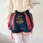 These are 16th century Renaissance inspired hotpants, panelled with navy velvet with a red silk lining and hand-embroidered butt slogan, which I believe is like 300% historically accurate. They’re actually modelled off a genuine Tudor pattern but then made ridiculous because who am I.
