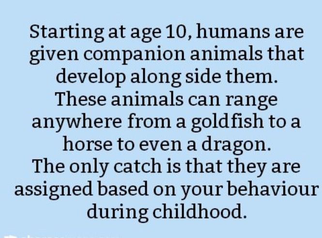 This particular take is indeed very close to daemons, though, especially with the elements of the animal companion’s shape being determined by something in the child’s nature. But I mean, the prompt presented an interesting twist on it, and I don’t know enough about His Dark Materials to just straight up write fanfiction for it, and wouldn’t want to wrestle with the same theological themes either. So instead I did this.