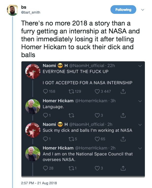 she didn’t lose her internship because “her friends” used a hashtag, she lost it because a bunch of 4chan fuckers found out she’s trans and decided to doxx her and harass her employer about the ~image~ she was sending. like this wasn’t her public face account, she wasn’t spouting racist garbage, she mistook someone in her mentions for one of the randos she gets regularly harassed by (because, yknow, if someone tweets “language” at you on twitter, 99.9% of the time they’re not actually concerned for you) and transphobes used the opportunity to fuck up her life. it’s great that hickam is behind her on this but a lot of people are sharing this and laughing at how hilarious it is that “a furry got fired for swearing”, which is the smokescreen being used to cover how this was doxxing a trans woman to ruin her potential career