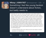 And if you get to a point where it’s bad to have dark thoughts and it’s bad to wonder what something would be like and it’s bad to put yourself in the shoes of anyone who isn’t “pure”, if fiction is no longer a realm where you can confront and explore, but an ongoing test of moral purity… well, maybe not everyone’s brain works like mine, but I feel like that takes away something incredibly important to being human.