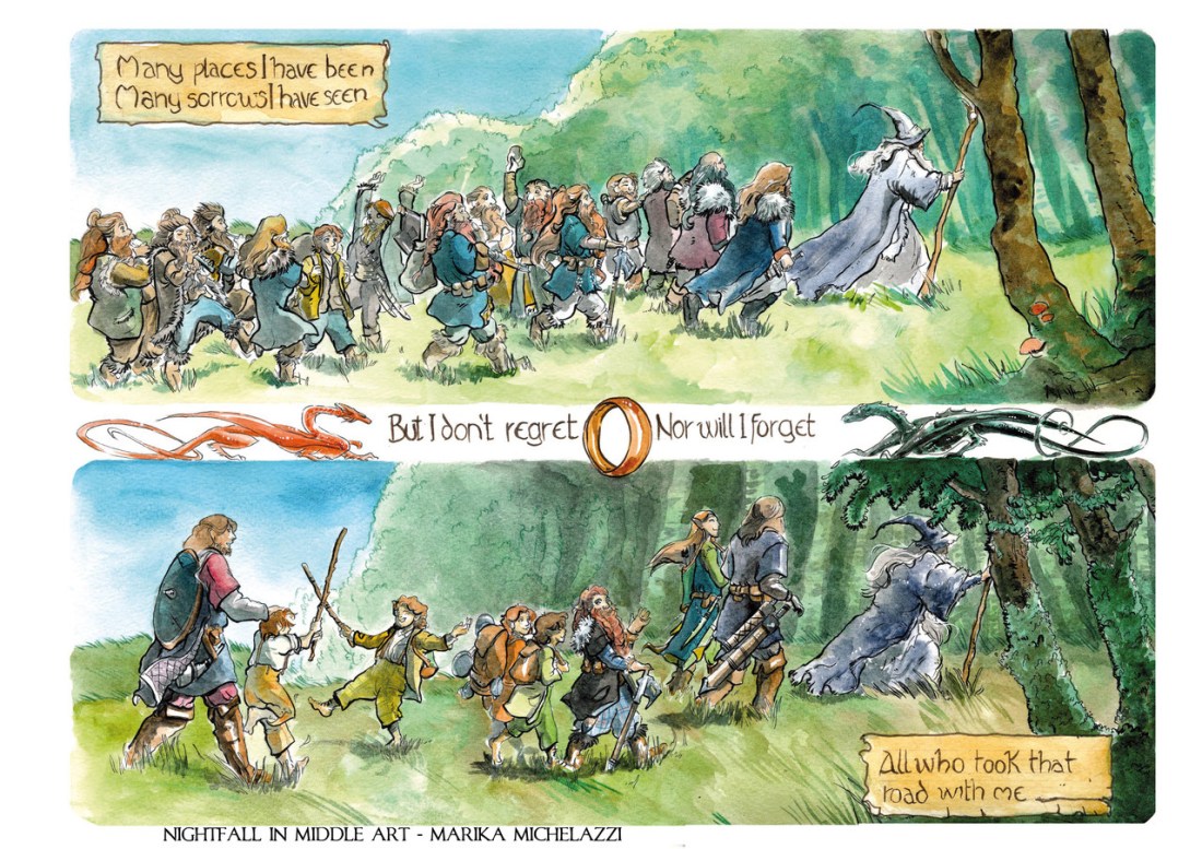 (The Last Goodbye, Billy Boyd).“The Company of Thorin & the Fellowship od the Ring, after Rivendell”, watercolours and golden ink.