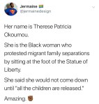 It is a very rare thing for me to disagree so hard with a progressive Black woman, but Therese Patricia Okoumou IS a hero. And she certainly did not let anyone down. Fighting for young children who were being caged and separated from their parents is never ever the wrong thing to do. What she did—resisting Trump and publicly speaking truth to power—required great courage. Okoumou is a hero and an activist. A social justice warrior in the truest sense of the word.