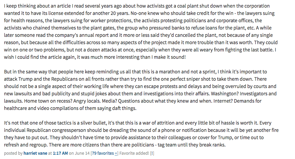 But in the same way that people here keep reminding us all that this is a marathon and not a sprint, I think it’s important to attack Trump and the Republicans on all fronts rather than try to find the one perfect sniper shot to take them down. There should not be a single aspect of their working life where they can escape protests and delays and being overruled by courts and new lawsuits and bad publicity and stupid jokes about them and investigations into their affairs. Washington? Investigators and lawsuits. Home town on recess? Angry locals. Media? Questions about what they knew and when. Internet? Demands for healthcare and video compilations of them saying daft things.